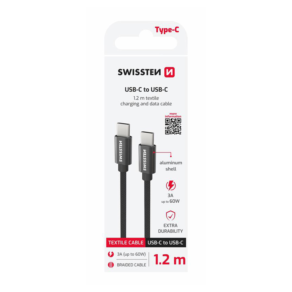 SWISSTEN USB-C do USB-C 1,2 m; Kabel z visokokakovostno tekstilno pletenico, primeren za povezovanje naprav s priključki USB-C.